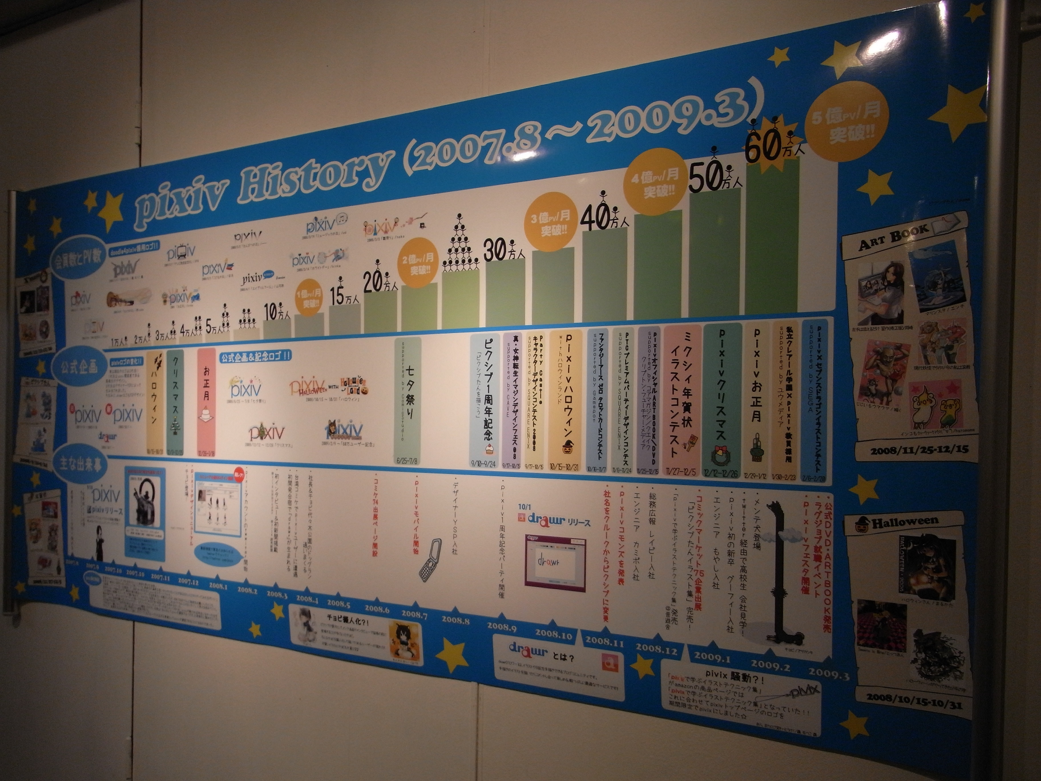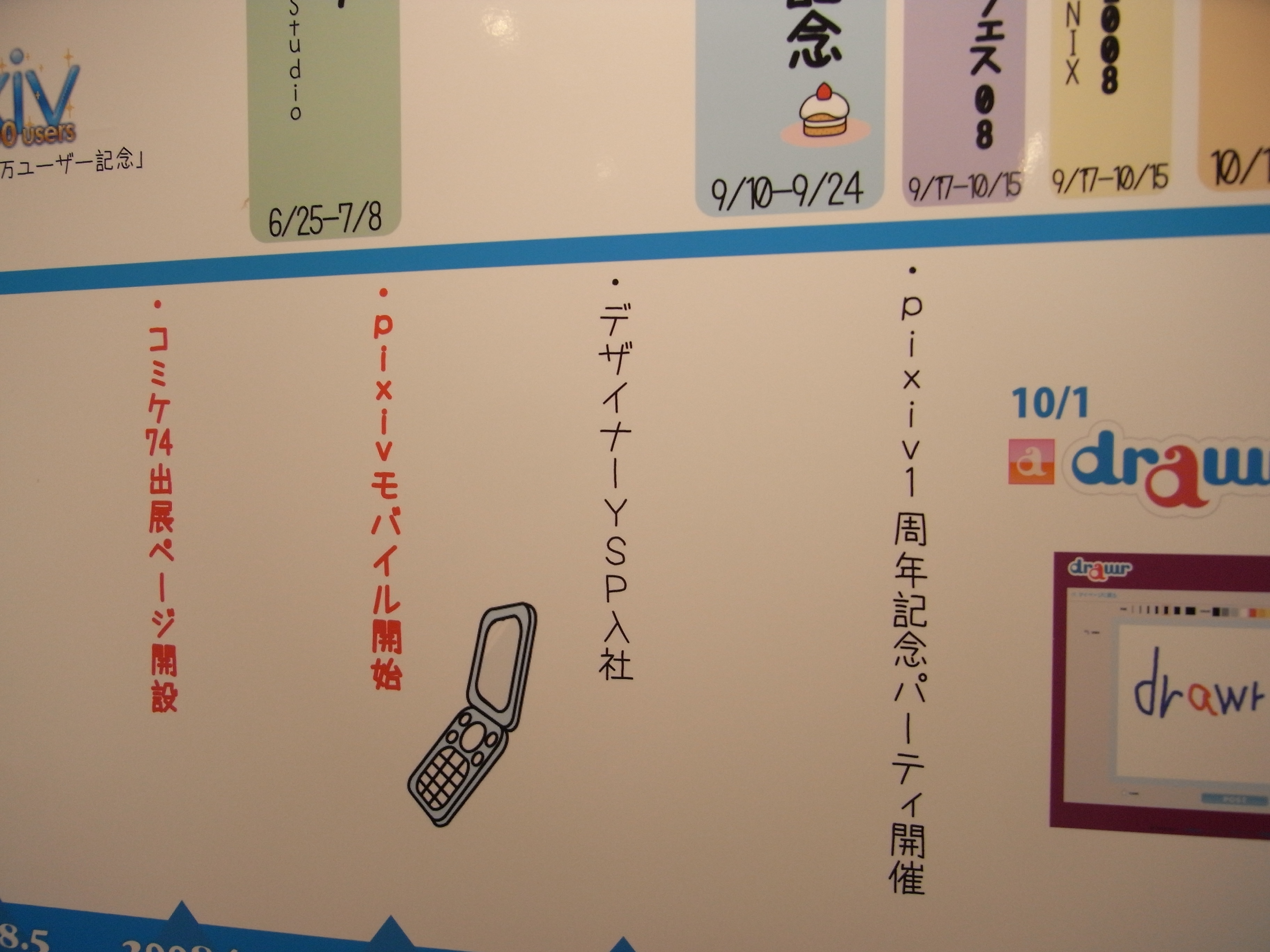 2階のグッズ販売所では、pixivの歴史が壁にどどーんと張り出されていて、思いがけず長時間見入ってしまいました。